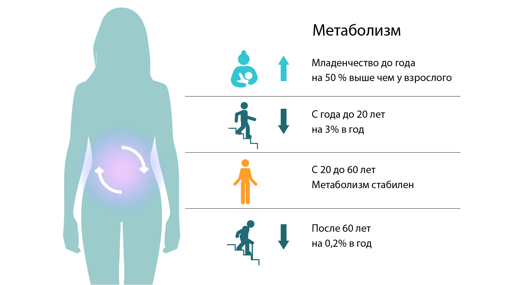 Исследования показывают, что с 20 до 60 лет общий ежедневный расход энергии примерно одинаковый. И только после 60 лет метаболизм замедляется на 0,7% каждый год, что связывают со снижением количества мышечной ткани, одной из самых «прожорливых» в нашем организме. Но после наступления менопаузы женщинам становится сложнее сохранять прежний вес, а килограммы «прилипают» быстрее. Дело в том, что начиная с 45 лет организм постепенно начинает тратить меньше энергии на обеспечение своих базовых потребностей. При активном образе жизни эта разница может быть незаметна, а при сидячей работе и отсутствии физических нагрузок добавит лишние килограммы.1